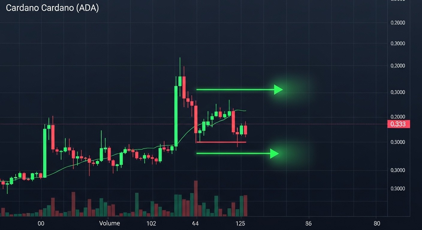 Le prix de l’ADA oscille actuellement autour de 0,33 $, un seuil qui, loin d’être anodin, représente un support majeur sur les unités de temps élevées. Deux rebonds successifs depuis cette zone dessinent ce que les analystes techniques appellent un double bottom – une figure de retournement haussier classique. Mais est-ce vraiment le début d’un reversal ou simplement une pause avant une nouvelle vague baissière ?
