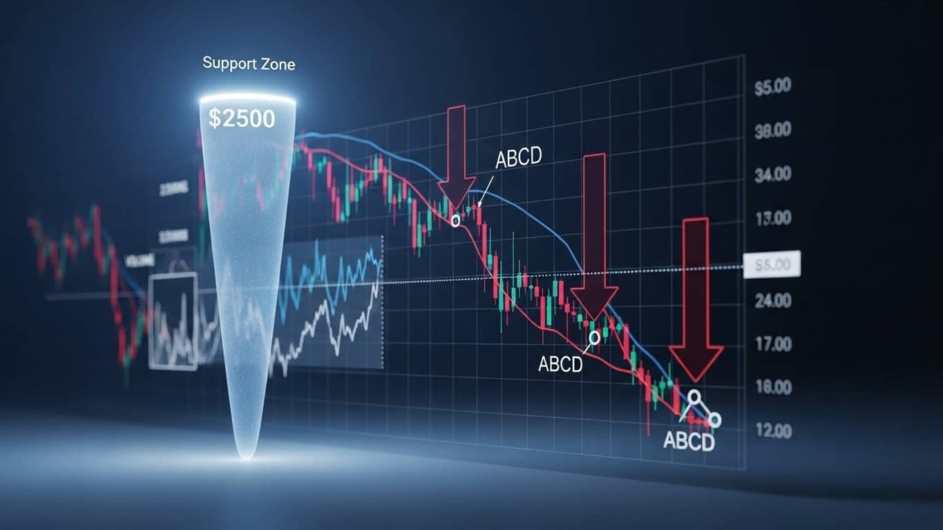 Le mouvement commence par une impulsion baissière forte (segment AB), suivie d’une retracement haussier modéré (BC), et enfin d’une extension qui devrait amener le prix vers un point D calculé. Ce point D correspond ici à la région des 2500 dollars, un niveau qui possède déjà une importance historique et volumétrique majeure.
