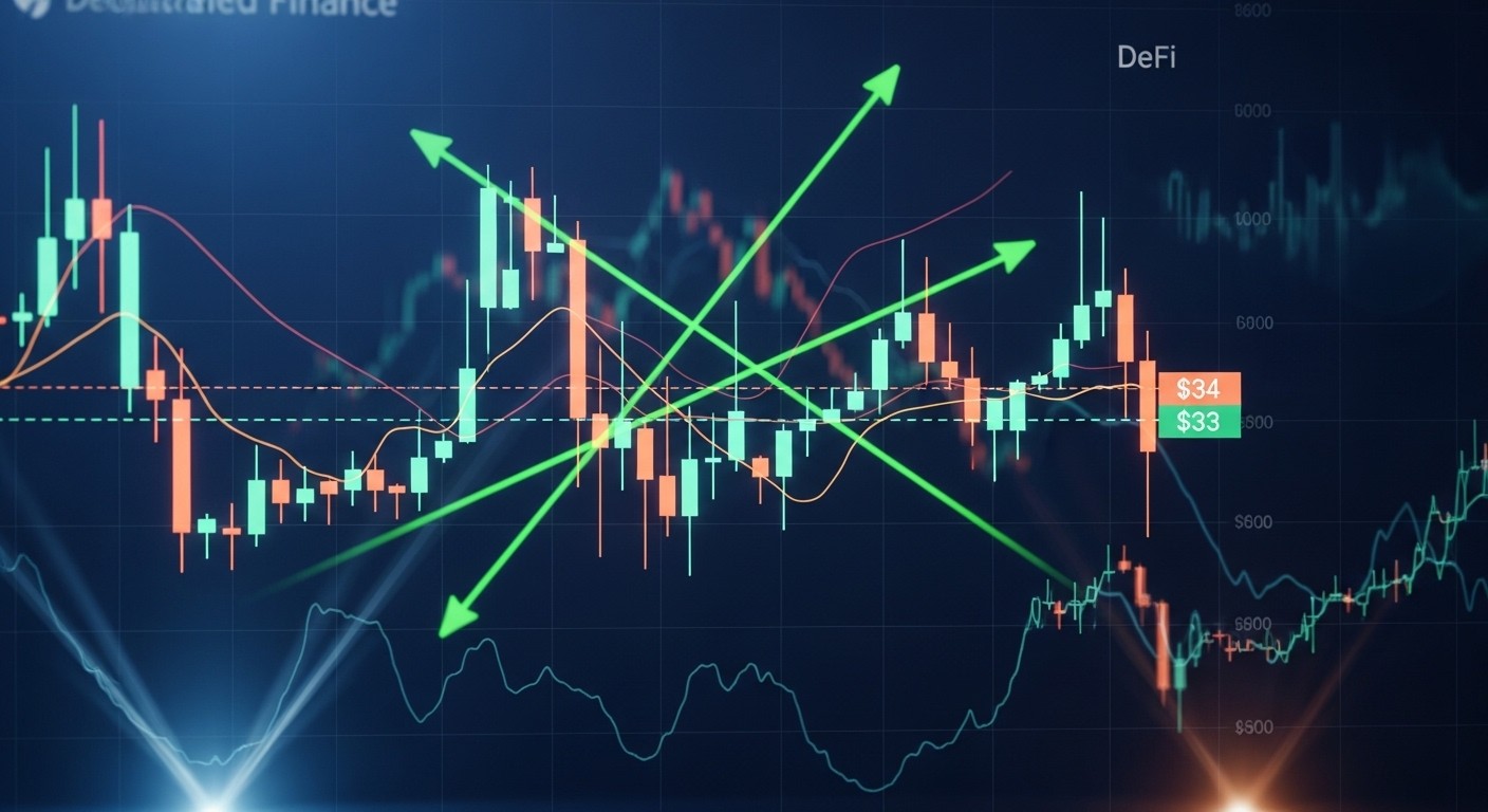 Ce signal n’arrive pas dans le vide. Il survient après plusieurs semaines de consolidation et juste au moment où le prix teste une zone de résistance critique entre 33 $ et 34 $. Les bandes de Bollinger commencent également à s’écarter après une longue phase de compression : un classique prélude à une expansion de volatilité.