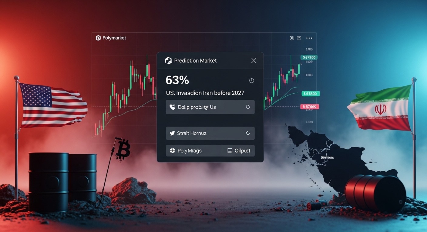 Imaginez un marché où des milliers de traders misent des millions de dollars sur l’issue d’un conflit potentiel entre les États-Unis et l’Iran. Aujourd’hui, Polymarket, la plateforme de prédiction décentralisée, affiche une probabilité de 63 % pour une invasion américaine avant 2027. Ce chiffre n’est pas sorti d’un sondage d’opinion : il reflète l’argent réel engagé par des participants qui risquent leurs fonds sur un résultat binaire. Bitcoin, lui, reste coincé près des 67 500 dollars, comme s’il hésitait entre la peur et l’absorption de cette nouvelle incertitude géopolitique.