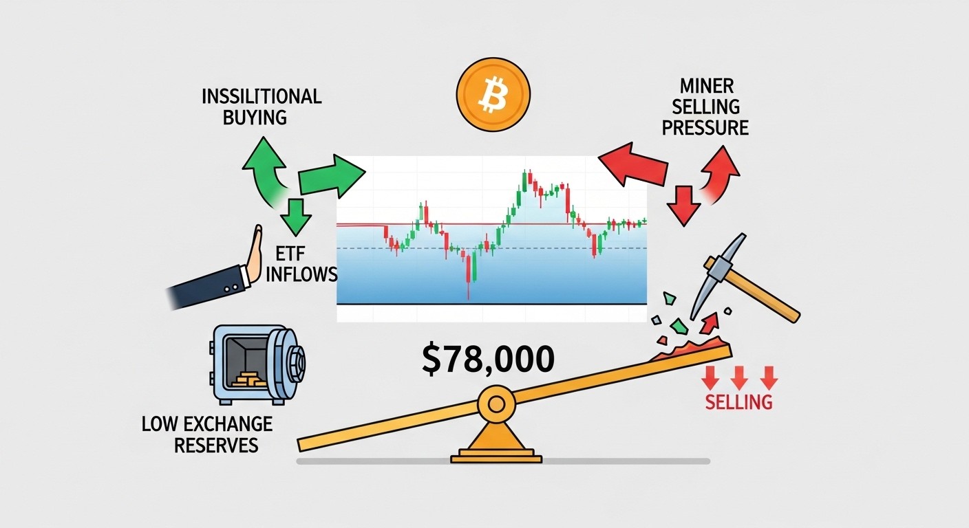 En résumé, la consolidation actuelle du Bitcoin autour de 78 000 dollars résulte d’un équilibre complexe entre :